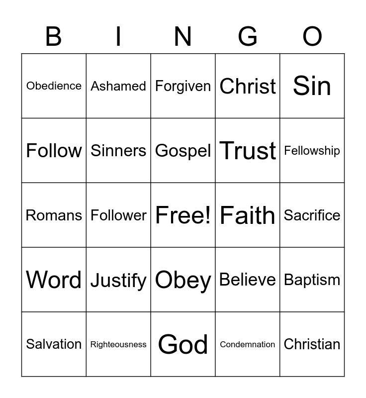 This bingo card has a free space and 24 words: Justify, Righteousness, Gospel, Salvation, Sin, Obedience, Follow, Ashamed, Faith, Obey, Trust, Romans, Believe, Baptism, Sinners, Condemnation, Sacrifice, Forgiven, Fellowship, Follower, Christian, Word, Christ and God.