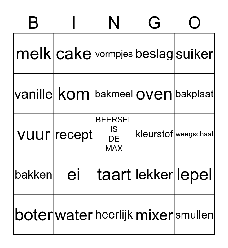This bingo card has a free space and 24 words: ei, water, bakmeel, boter, suiker, melk, vanille, cake, kleurstof, taart, oven, vuur, lekker, lepel, kom, mixer, weegschaal, vormpjes, bakplaat, recept, smullen, bakken, beslag and heerlijk.