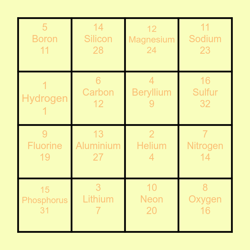 This bingo card has 16 words: 3 Lithium 7, 7 Nitrogen 14, 12 Magnesium 24, 5 Boron 11, 9 Fluorine 19, 14 Silicon 28, 2 Helium 4, 10 Neon 20, 1 Hydrogen 1, 6 Carbon 12, 15 Phosphorus 31, 11 Sodium 23, 13 Aluminium 27, 16 Sulfur 32, 4 Beryllium 9 and 8 Oxygen 16.
