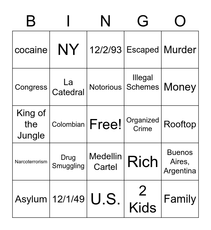 This bingo card has a free space and 24 words: Drug Smuggling, 12/1/49, Notorious, Asylum, Murder, cocaine, Congress, NY, Organized Crime, Medellin Cartel, Illegal Schemes, King of the Jungle, Rich, Buenos Aires, Argentina, La Catedral, 2 Kids, Rooftop, 12/2/93, Money, Colombian, Family, Narcoterrorism, Escaped and U.S..