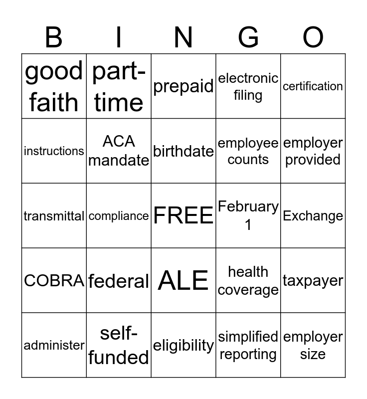 This bingo card has a free space and 39 words: 1095, 2016, 6056, ACA mandate, administer, ALE, birthdate, calendar, certification, COBRA, compliance, electronic filing, employer size, Exchange, February 1, federal, full-time, good faith, Hawaiʻi, health coverage, instructions, eligibility, employee counts, employer provided, insurers, IRS, Medicaid, minimum essential, Obamacare, part-time, penalties, policy, prepaid, self-funded, simplified reporting, small business, taxpayer, transmittal and W-2.