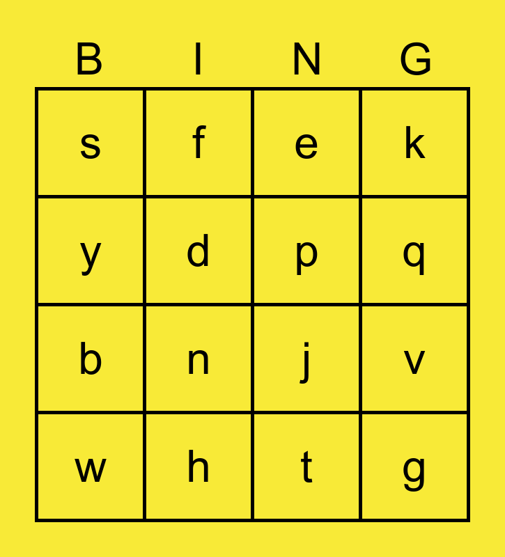 This bingo card has 27 words: Free!, a, b, c, d, e, f, g, h, i, j, k, l, m, n, o, p, q, r, s, t, u, v, w, x, y and z.