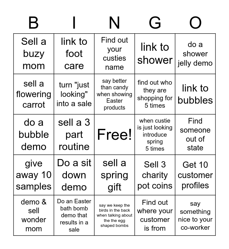 This bingo card has a free space and 24 words: Do a sit down demo, Do an Easter bath bomb demo that results in a sale, say better than candy when showing Easter products, demo & sell wonder mom, do a shower jelly demo, Sell a buzy mom, sell a flowering carrot, link to foot care, when custie is just looking introduce spring 5 times, sell a spring gift, find out who they are shopping for 5 times, do a bubble demo, Sell 3 charity pot coins, Get 10 customer profiles, turn "just looking" into a sale, Find out where your customer is from, Find someone out of state, Find out your custies name, link to bubbles, sell a 3 part routine, say something nice to your co-worker, give away 10 samples, link to shower and say we keep the birds in the back when talking about the the egg shaped bombs.