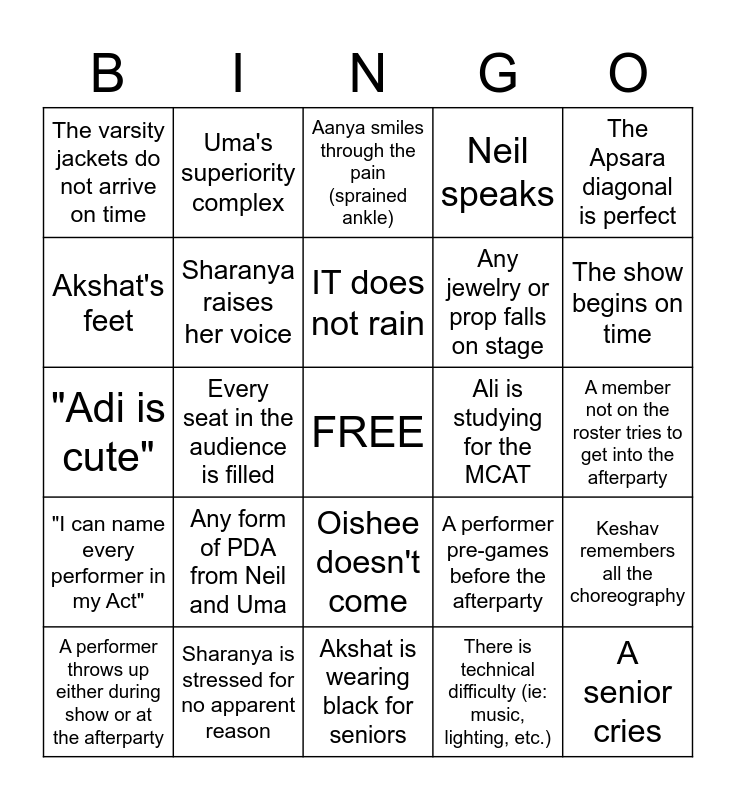 This bingo card has a free space and 24 words: Any form of PDA from Neil and Uma, Sharanya is stressed for no apparent reason, IT does not rain, A performer throws up either during show or at the afterparty, The Apsara diagonal is perfect, The varsity jackets do not arrive on time, Akshat's feet, Uma's superiority complex, Ali is studying for the MCAT, Oishee doesn't come, Any jewelry or prop falls on stage, "Adi is cute", A performer pre-games before the afterparty, Keshav remembers all the choreography, Sharanya raises her voice, There is technical difficulty (ie: music, lighting, etc.), A member not on the roster tries to get into the afterparty, Aanya smiles through the pain (sprained ankle), The show begins on time, Every seat in the audience is filled, A senior cries, "I can name every performer in my Act", Neil speaks and Akshat is wearing black for seniors.