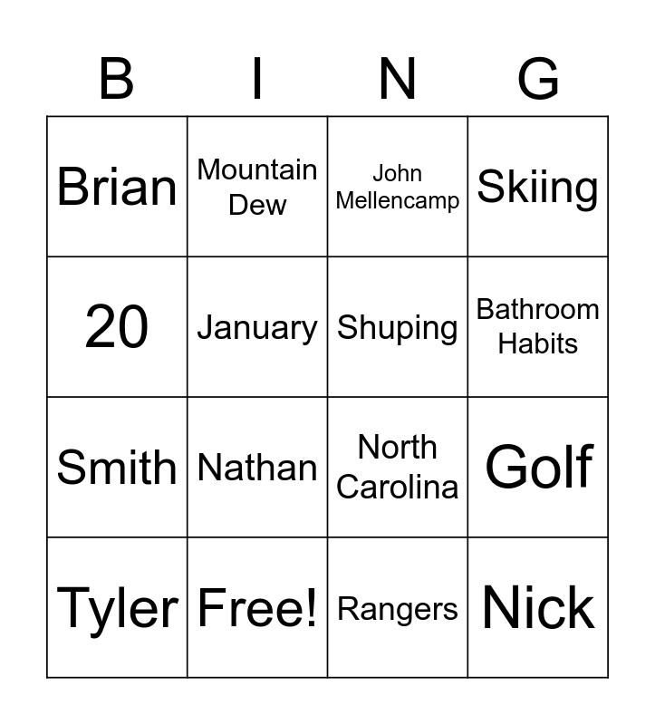 This bingo card has 31 words: Brianna, Nick, Golf, Once, Brian, John Mellencamp, Shuping, Cowboys, Free!, Buccaneers, Rangers, Tyler, Kyle, Dylan, Nathan, New York, Basketball, Kyle, Nick, 30, 20, 2, Coors Light, Mountain Dew, Smith, January, Skiing, North Carolina, Hauling, Bathroom Habits and Vodka.