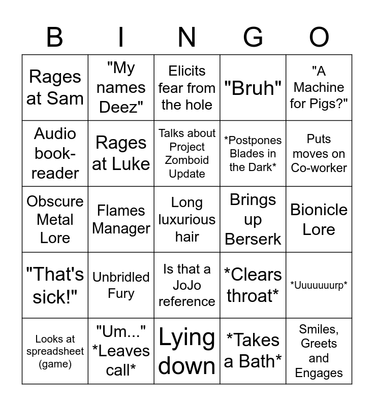 This bingo card has a free space and 24 words: Unbridled Fury, "Um..." *Leaves call*, Talks about Project Zomboid Update, Looks at spreadsheet (game), "A Machine for Pigs?", Rages at Sam, Audio book-reader, "My names Deez", Brings up Berserk, Is that a JoJo reference, *Postpones Blades in the Dark*, Obscure Metal Lore, *Clears throat*, *Uuuuuuurp*, Rages at Luke, *Takes a Bath*, Bionicle Lore, Elicits fear from the hole, Puts moves on Co-worker, Flames Manager, Smiles, Greets and Engages, "That's sick!", "Bruh" and Lying down.