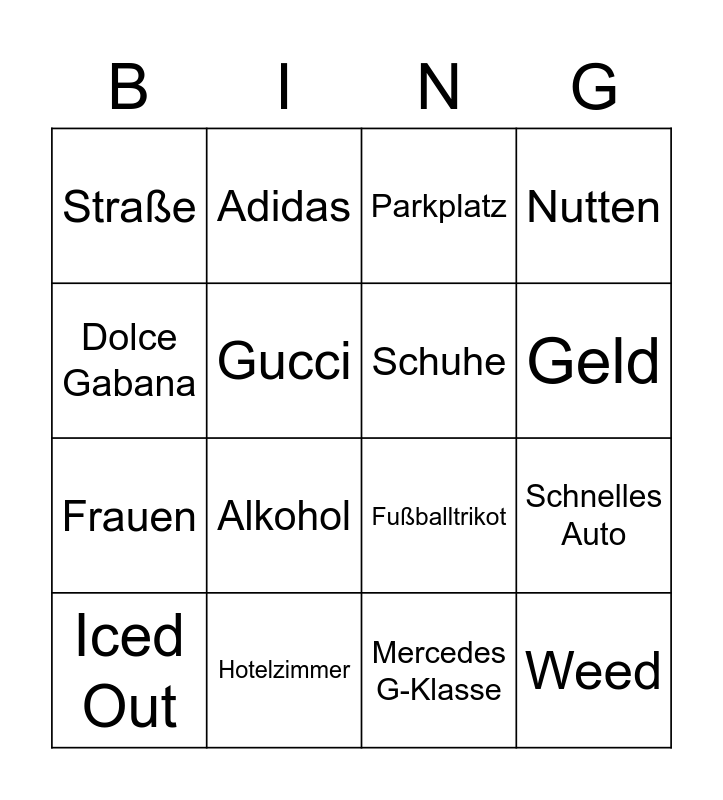This bingo card has 16 words: Hotelzimmer, Schnelles Auto, Parkplatz, Straße, Frauen, Adidas, Fußballtrikot, Mercedes G-Klasse, Dolce Gabana, Gucci, Iced Out, Nutten, Alkohol, Geld, Schuhe and Weed.