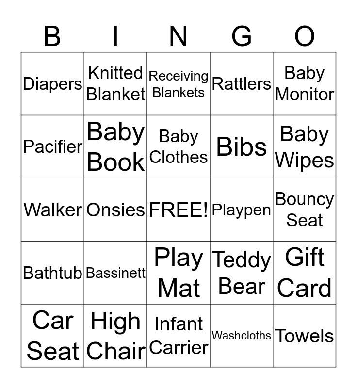 This bingo card has a free space and 29 words: Car Seat, Stroller, Onsies, Sheets, Diapers, Receiving Blankets, Baby Book, Bassinett, Playpen, High Chair, Bouncy Seat, Towels, Infant Carrier, Washcloths, Baby Wipes, Swing, Play Mat, Bathtub, Baby Monitor, Walker, Teddy Bear, Diaper Bag, Bibs, Pacifier, Rattlers, Knitted Blanket, Gift Card, Baby Clothes and Baby Toiletries.