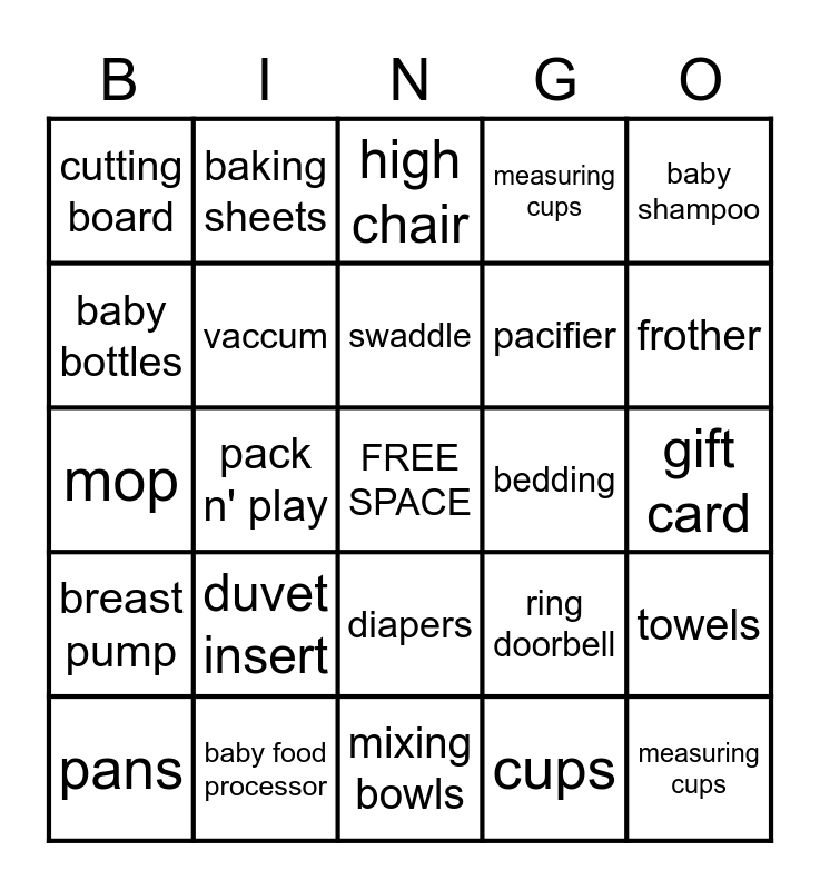 This bingo card has a free space and 29 words: pans, stroller, pack n' play, knives, cutting board, high chair, vaccum, duvet insert, bedding, baby food processor, gift card, measuring cups, mixing bowls, cups, frother, baby carrier, diapers, breast pump, baby shampoo, mop, ring doorbell, teether, pacifier, baby bottles, measuring cups, baking sheets, towels, swaddle and bibs.