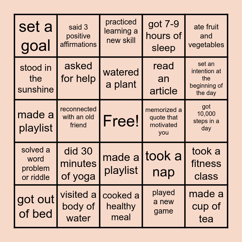 This bingo card has a free space and 24 words: did 30 minutes of yoga, visited a body of water, watered a plant, got out of bed, ate fruit and vegetables, set a goal, stood in the sunshine, said 3 positive affirmations, memorized a quote that motivated you, made a playlist, read an article, made a playlist, took a nap, took a fitness class, asked for help, played a new game, got 10,000 steps in a day, practiced learning a new skill, set an intention at the beginning of the day, reconnected with an old friend, made a cup of tea, solved a word problem or riddle, got 7-9 hours of sleep and cooked a healthy meal.