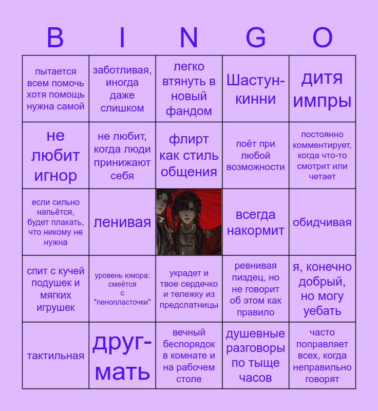 This bingo card has a free space and 24 words: уровень юмора: смеётся с "пенопласточки", друг- мать, флирт как стиль общения, тактильная, дитя импры, пытается всем помочь хотя помощь нужна самой, не любит игнор, заботливая, иногда даже слишком, всегда накормит, украдет и твое сердечко и тележку из предслатницы, поёт при любой возможности, если сильно напьётся, будет плакать, что никому не нужна, ревнивая пиздец, но не говорит об этом как правило, я, конечно добрый, но могу уебать, не любит, когда люди принижают себя, душевные разговоры по тыще часов, обидчивая, легко втянуть в новый фандом, постоянно комментирует, когда что-то смотрит или четает, ленивая, часто поправляет всех, когда неправильно говорят, спит с кучей подушек и мягких игрушек, Шастун-кинни and вечный беспорядок в комнате и на рабочем столе.