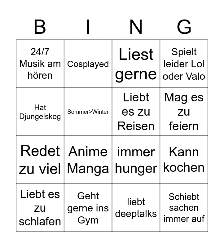 This bingo card has 16 words: Geht gerne ins Gym, Kann kochen, Liest gerne, 24/7 Musik am hören, Redet zu viel, Cosplayed, immer hunger, liebt deeptalks, Hat Djungelskog, Sommer>Winter, Liebt es zu schlafen, Spielt leider Lol oder Valo, Anime Manga, Mag es zu feiern, Liebt es zu Reisen and Schiebt sachen immer auf.