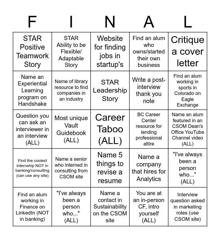 This bingo card has a free space and 24 words: Find an alum working in Finance on LinkedIn (NOT in banking), Name a senior who interned in consulting from CSOM site, STAR Leadership Story, You are at an in-person CF, intro yourself (ALL), Critique a cover letter, STAR Positive Teamwork Story, STAR Ability to be Flexible/ Adaptable Story, Website for finding jobs in startup's, BC Career Center resource for lending professional attire, Name an alum featured in an CSOM Dean's Office YouTube Channel video (ALL), Question you can ask an interviewer in an interview (ALL), Name of library resource to find companies in an industry, Name a company that hires for Analytics, "I've always been a person who..." (ALL), Name an Experiential Learning program on Handshake, "I've always been a person who..." (ALL), Name a contact in Sustainability on the CSOM site, Find an alum who owns/started their own business, Find an alum working in sports in Colorado on Eagle Exchange, Find the coolest internship NOT in banking/consulting (can use any site), Most unique Vault Guidebook (ALL), Name 5 things to revise a resume, Write a post-interview thank you note and Interview question asked in marketing roles (use CSOM site).
