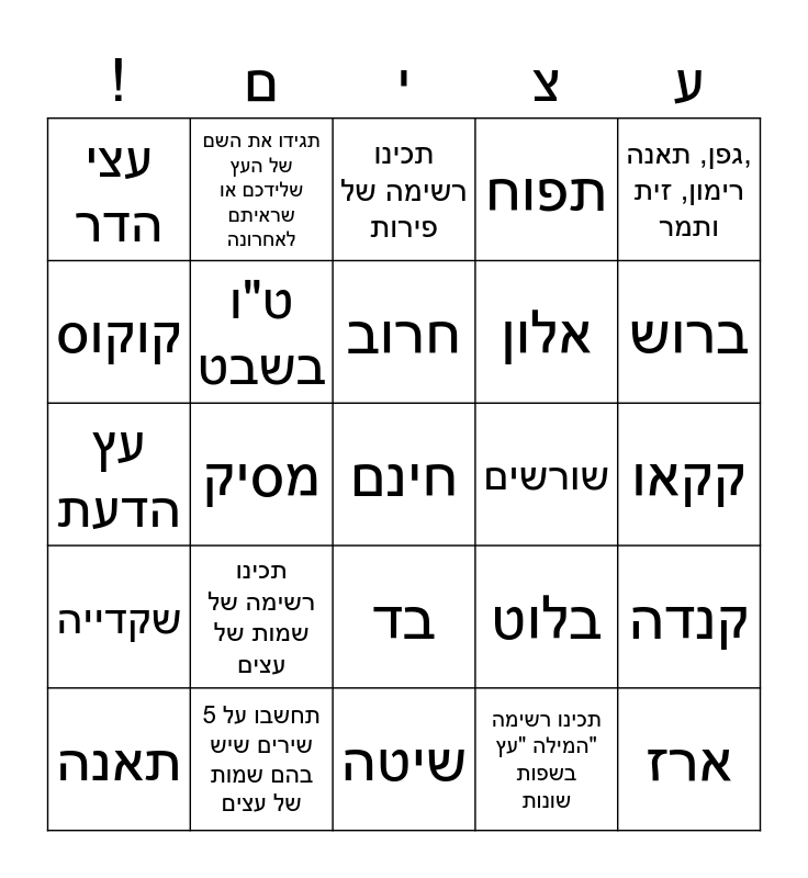 This bingo card has a free space and 29 words: תאנה, תחשבו על 5 עצים שהם גם שמות של ילדים, מסיק, אצטרובל, עצי הדר, תכינו רשימה של פירות, ט"ו בשבט, תכינו רשימה של שמות של עצים, שורשים, תחשבו על 5 שירים שיש בהם שמות של עצים, קקאו, ארז, שיטה, תכינו רשימה המילה "עץ" בשפות שונות, ברוש, בבית בד, בד, שקדייה, גפן, תאנה, רימון, זית ותמר, עץ הדעת, בלוט, אדר, אלון, קוקוס, תפוח, תגידו את השם של העץ שלידכם או שראיתם לאחרונה, קנדה, חרוב and תות.