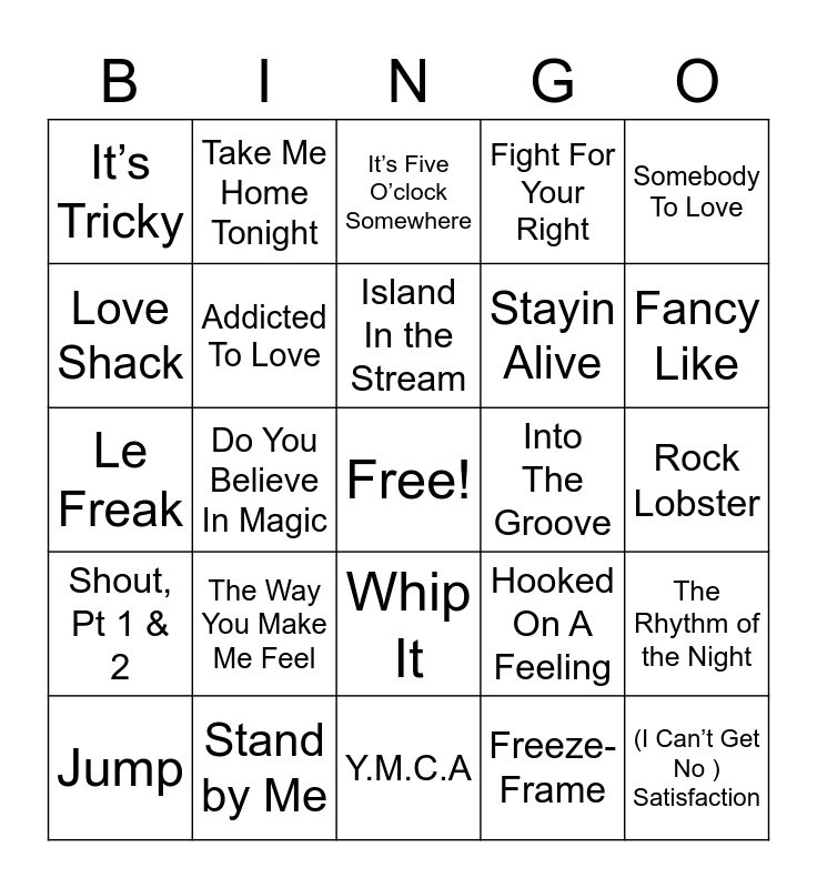 This bingo card has a free space and 71 words: Love Grows ( where My Rosemary Goes), Take Me Home Tonight, Take It On The Run, Tainted Love, Y.M.C.A, Bohemian Rhapsody, Fight For Your Right, I Will Survive, Stayin Alive, Jolene, Jump, Piano Man, Fancy Like, It’s Tricky, Dancing Queen, Le Freak, Hooked On A Feeling, Somebody To Love, U Can’t Touch This, Rock Lobster, The Way You Make Me Feel, (I Can’t Get No ) Satisfaction, The Rhythm of the Night, Brick House, Express Yourself, Do Wah Diddy Diddy, Girls Just Want To Have Fun, I’m Still Standing, Love Is A Battlefield, Bust A Move, Stand by Me, Disco Inferno, What I Like About You, Hey Mickey You’re so Fine, Freeze-Frame, Apache (Jump On It), Don’t You Want Me Baby, Kids In America, Love Shack, Sugar Sugar, Whip It, Ice Ice Baby, Shout, Pt 1 & 2, We Got The Beat, Heartbreaker, 867-5309/Jenny, Car wash, Addicted To Love, Let’s Dance, Signed,Sealed,Delivered (I’m Yours), I’m Coming Out, She’s A Lady, Into The Groove, Before He Cheats, Friends In Low Places, Manic Monday, Island In the Stream, Happy, Tubthumping, CANT STOP THE FEELING, Just Dance, Why Can’t We Be Friends, Do You Believe In Magic, (I just) Died In Your Arms, You Belong With Me, Mambo No. 5 ( a Little Bit of…), It’s Five O’clock Somewhere, The Sign, Wannabe, Don’t Go Breaking My Heart and No Scrubs.