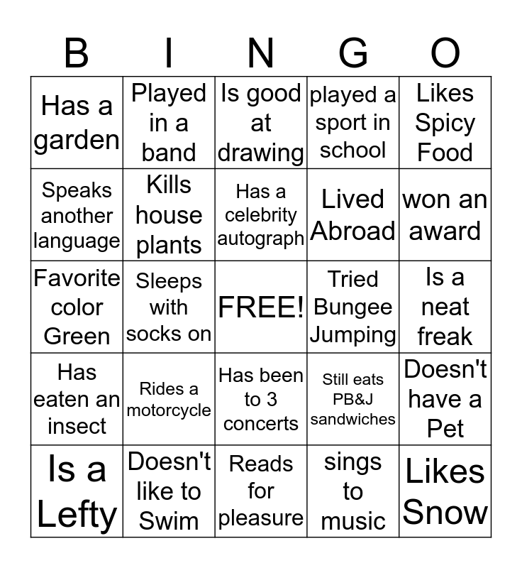 This bingo card has a free space and 24 words: Rides a motorcycle, Doesn't like to Swim, Has a celebrity autograph, Is a Lefty, Likes Spicy Food, Has a garden, Speaks another language, Played in a band, Tried Bungee Jumping, Has been to 3 concerts, Lived Abroad, Favorite color Green, Still eats PB&J sandwiches, Doesn't have a Pet, Kills house plants, sings to music, Is a neat freak, Is good at drawing, won an award, Sleeps with socks on, Likes Snow, Has eaten an insect, played a sport in school and Reads for pleasure.
