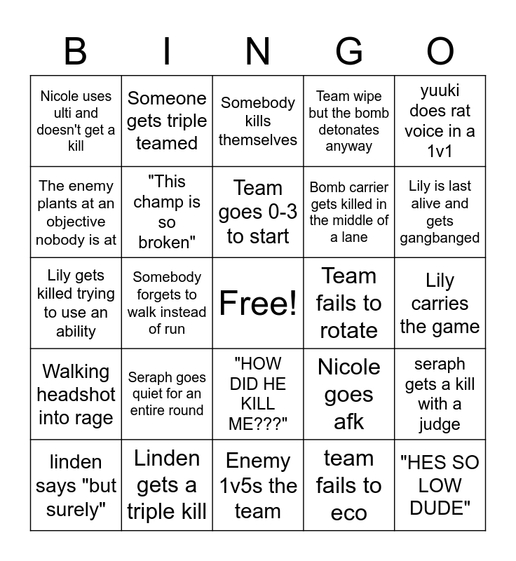 This bingo card has a free space and 24 words: Seraph goes quiet for an entire round, Linden gets a triple kill, Team goes 0-3 to start, linden says "but surely", yuuki does rat voice in a 1v1, Nicole uses ulti and doesn't get a kill, The enemy plants at an objective nobody is at, Someone gets triple teamed, Team fails to rotate, "HOW DID HE KILL ME???", Bomb carrier gets killed in the middle of a lane, Lily gets killed trying to use an ability, Nicole goes afk, seraph gets a kill with a judge, "This champ is so broken", team fails to eco, Lily carries the game, Somebody kills themselves, Lily is last alive and gets gangbanged, Somebody forgets to walk instead of run, "HES SO LOW DUDE", Walking headshot into rage, Team wipe but the bomb detonates anyway and Enemy 1v5s the team.