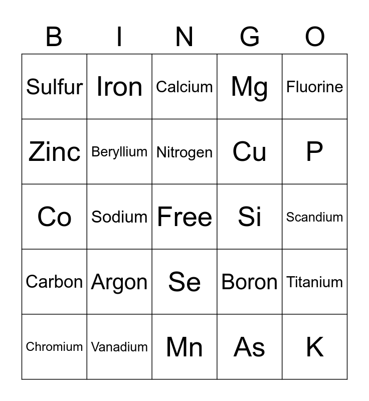 This bingo card has a free space and 36 words: Hydrogen, Helium, Lithium, Beryllium, Boron, Carbon, Nitrogen, Oxygen, Fluorine, Neon, Sodium, Mg, Aluminum, Si, P, Sulfur, Chlorine, Argon, K, Calcium, Scandium, Titanium, Vanadium, Chromium, Mn, Iron, Co, Ni, Cu, Zinc, Ga, Ge, As, Se, Br and Kr.