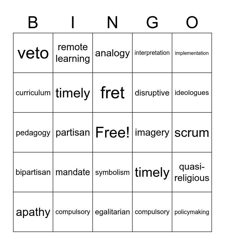 This bingo card has a free space and 24 words: mandate, compulsory, fret, apathy, implementation, veto, curriculum, remote learning, imagery, symbolism, disruptive, pedagogy, timely, quasi-religious, timely, compulsory, scrum, analogy, ideologues, partisan, policymaking, bipartisan, interpretation and egalitarian.