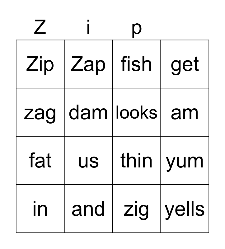 This bingo card has 16 words: and, yum, fish, Zip, fat, Zap, thin, zig, zag, dam, in, get, us, am, looks and yells.