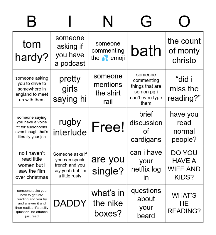 This bingo card has a free space and 24 words: Someone asks if you can speak french and you say yeah but i’m a little rusty, DADDY, someone mentions the shirt rail, someone asks you how to get into reading and you try and answer it and then realise it’s a silly question. no offence just read, the count of monty christo, tom hardy?, someone asking you to drive to somewhere in england to meet up with them, someone asking if you have a podcast, brief discussion of cardigans, are you single?, someone commenting things that are so non pg i can’t even type them, someone saying you have a voice fit for audiobooks even though that’s literally your job, can i have your netflix log in, DO YOU HAVE A WIFE AND KIDS?, pretty girls saying hi, questions about your beard, have you read normal people?, someone commenting the 💦 emoji, “did i miss the reading?”, rugby interlude, WHAT’S HE READING?, no i haven’t read little women but i saw the film over christmas, bath and what’s in the nike boxes?.
