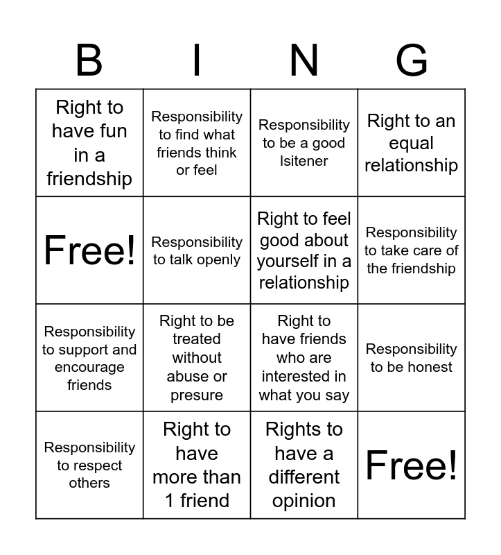 This bingo card has 16 words: Right to have more than 1 friend, Responsibility to be honest, Responsibility to be a good lsitener, Right to have fun in a friendship, Responsibility to support and encourage friends, Responsibility to find what friends think or feel, Right to have friends who are interested in what you say, Rights to have a different opinion, Free!, Responsibility to talk openly, Responsibility to respect others, Right to an equal relationship, Right to be treated without abuse or presure, Responsibility to take care of the friendship, Right to feel good about yourself in a relationship and Free!.
