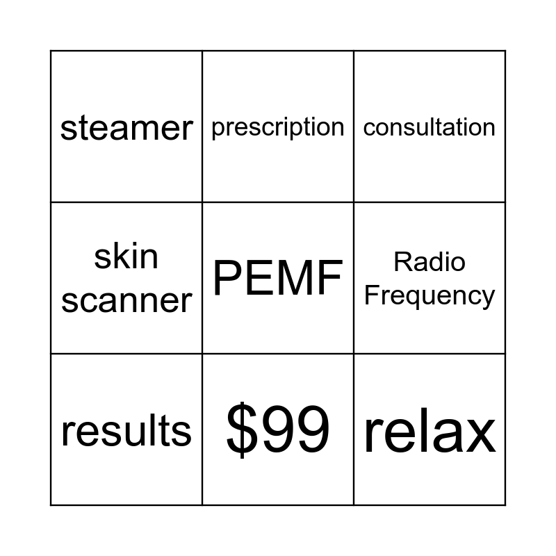 This bingo card has 9 words: results, consultation, prescription, skin scanner, steamer, Radio Frequency, PEMF, relax and $99.