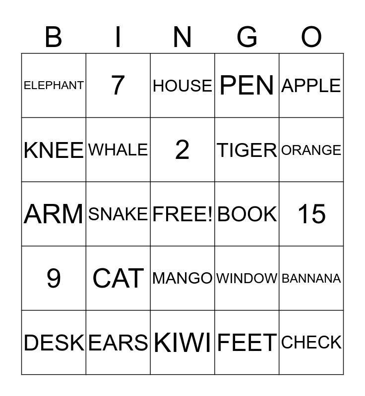 This bingo card has a free space and 24 words: CAT, EARS, 2, DESK, APPLE, ELEPHANT, KNEE, 7, BOOK, MANGO, TIGER, ARM, WINDOW, BANNANA, WHALE, FEET, 15, HOUSE, ORANGE, SNAKE, CHECK, 9, PEN and KIWI.