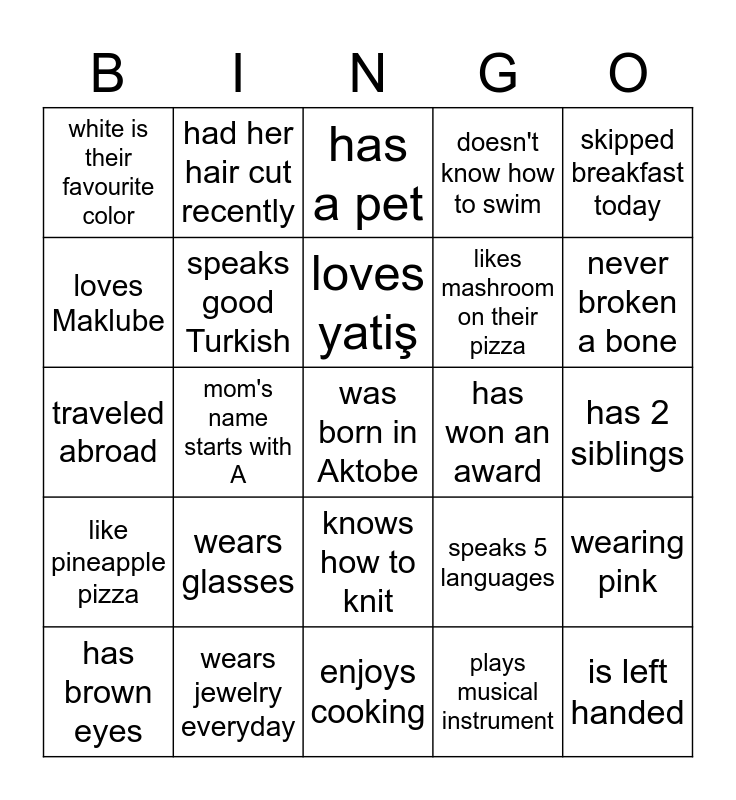 This bingo card has a free space and 24 words: wears glasses, wears jewelry everyday, loves yatiş, has brown eyes, skipped breakfast today, white is their favourite color, loves Maklube, had her hair cut recently, has won an award, knows how to knit, likes mashroom on their pizza, traveled abroad, speaks 5 languages, wearing pink, speaks good Turkish, plays musical instrument, has 2 siblings, has a pet, never broken a bone, mom's name starts with A, is left handed, like pineapple pizza, doesn't know how to swim and enjoys cooking.