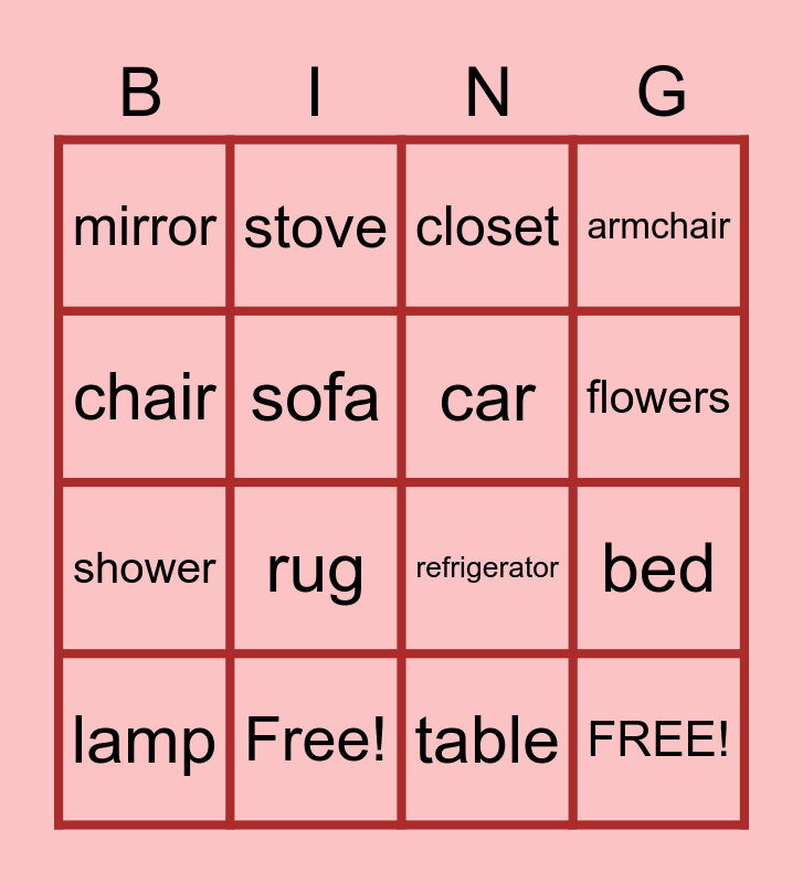 This bingo card has 16 words: Free!, bed, closet, mirror, shower, stove, refrigerator, table, chair, sofa, lamp, armchair, rug, flowers, car and FREE!.