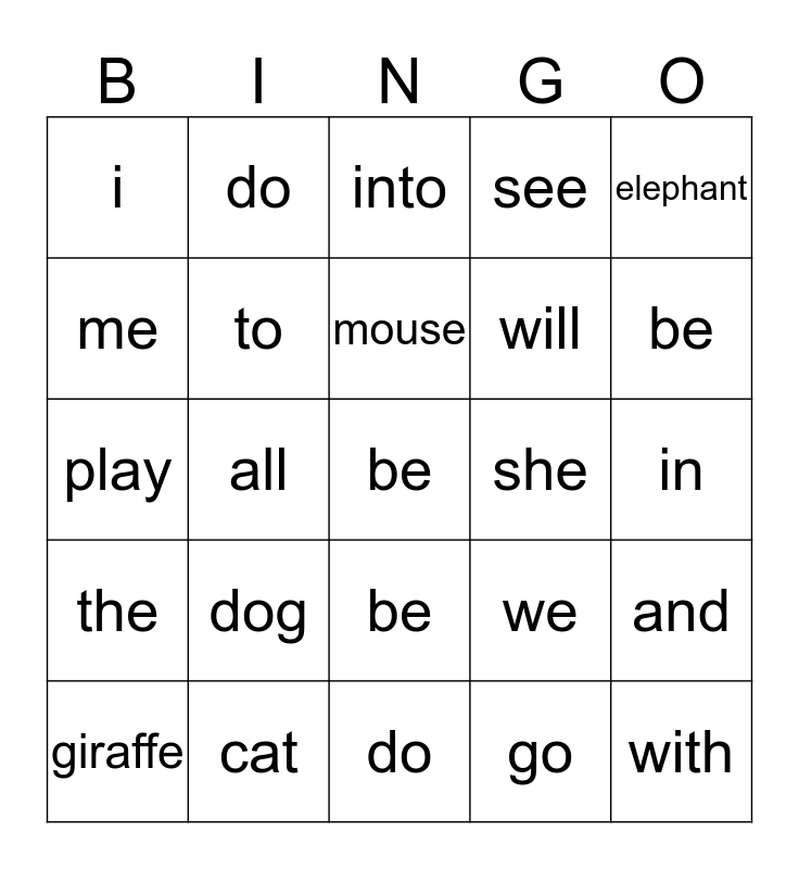 This bingo card has a free space and 24 words: dog, cat, mouse, giraffe, elephant, i, me, do, she, be, will, play, we, and, to, go, in, into, be, all, with, the, see and do.