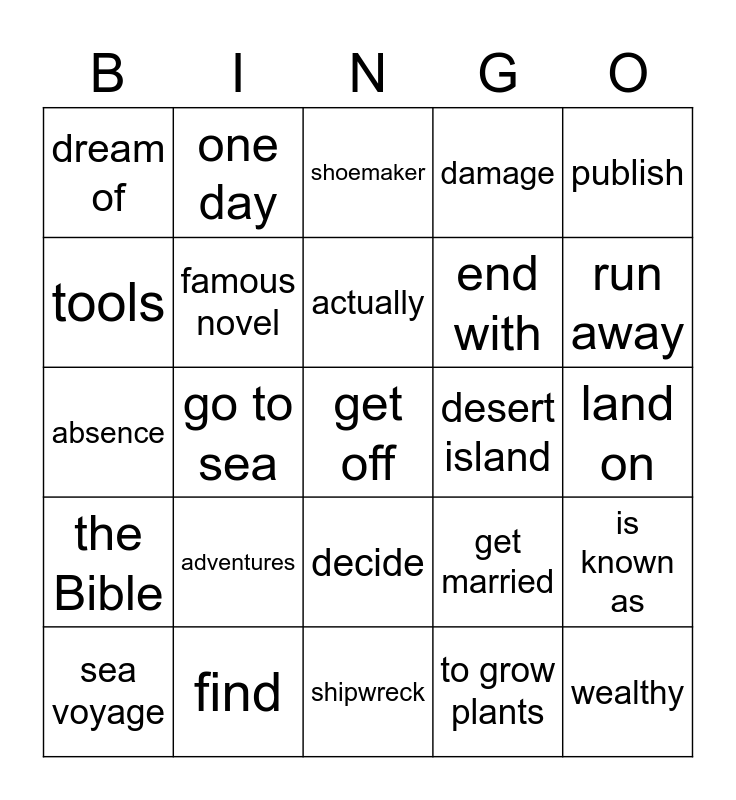This bingo card has 37 words: original title, real life story, main character, famous novel, is known as, adventures, actually, in short, publish, based on real facts, go to sea, damage, get off, land on, tools, the Bible, rescue, save, shoemaker, decide, desert island, dream of, run away, sea voyage, shipwreck, during, to grow plants, one day, footprint, extremely, grateful, under pirates control, find, absence, wealthy, get married, end with and survive.