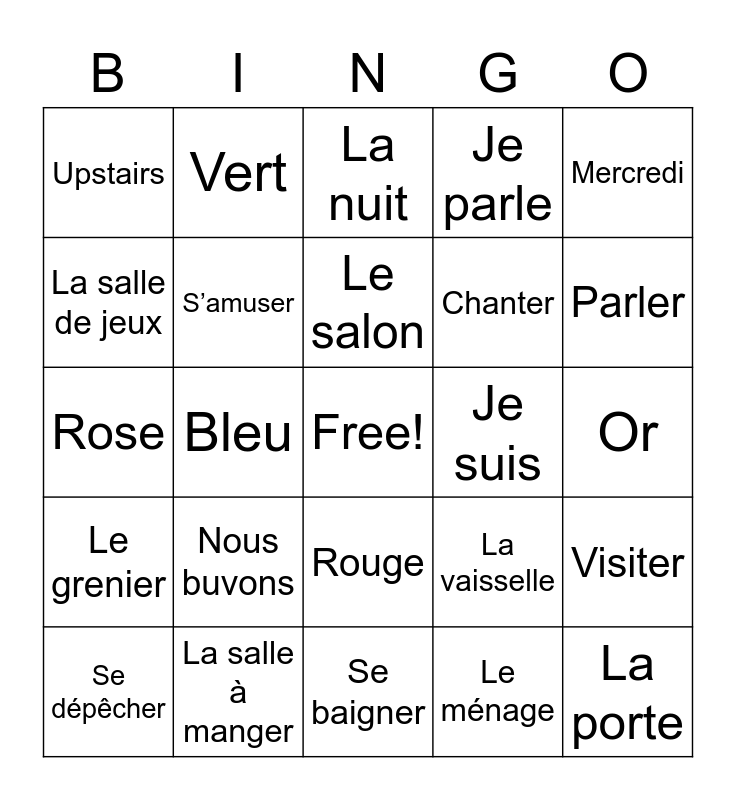 This bingo card has a free space and 103 words: Lundi, Mardi, Mercredi, Jeudi, Vendredi, Samedi, Dimanche, Un jour, Une semaine, Un mois, Hier, Aujourd’hui, Demain, La vie, Le matin, Le soir, La nuit, Le petit-déjeuner, Le déjeuner, Le dîner, Manger, Je mange, Nous mangeons, Boire, Je bois, Nous buvons, Parler, Je parle, Travailler, Je travaille, La vaisselle, Le ménage, Cuisiner, La maison, L’appartement, La chambre, La salle de bain, La cuisine, Le salon, La salle à manger, Le jardin, Le grenier, La cave, La salle de jeux, L’escalier, Upstairs, Downstairs, La porte, La fenêtre, Les rideaux, Une table, Une chaise, Un lit, Je m’assois, Je m’allonge, Dormir, Je dors, Le bureau, Jaune, Rouge, Or, Argent, Noir, Blanc, Orange, Violet, Marron, Vert, Rose, Bleu, Se baigner, Se brosser, Se coiffer, Se coucher, S’habiller, Se fâcher, Se laver, Se dépêcher, Se relaxer, Se reposer, Se réveiller, Se lever, S’amuser, J’ai, Je suis, Nous sommes, Nous avons, Aimer, Détester, Habite, Écouter, Jouer, Visiter, Chercher, Trouver, Donner, Chanter, Marcher, bonjour, au revoir, ca va mal, ca va bien and comme ci comme ca.