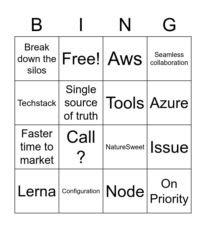This bingo card has 32 words: Tenant, Deployment, Issue, War Room, On Priority, Tools, Techstack, Product, Free!, Lazsa, Azure, Aws, DataBase, Secret, Configuration, Novartis, Daily standup, NatureSweet, Jira Ticket, Merge Request, Flyway Scripy, NPM, Node, Feature Flags, Lerna, Seamless collaboration, Faster time to market, Single source of truth, Break down the silos, Idea-to-Market Journey, We will come back to you and Call ?.