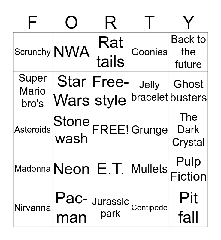This bingo card has a free space and 24 words: Neon, Pac-man, Free-style, Nirvanna, Back to the future, Scrunchy, Super Mario bro's, NWA, Grunge, E.T., Jelly bracelet, Asteroids, Mullets, Pulp Fiction, Star Wars, Centipede, The Dark Crystal, Rat tails, Ghost busters, Stone wash, Pit fall, Madonna, Goonies and Jurassic park.
