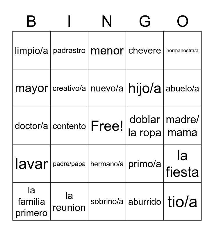 This bingo card has a free space and 24 words: padre/papa, la reunion, nuevo/a, la familia primero, hermanostra/a, limpio/a, mayor, padrastro, doblar la ropa, hermano/a, hijo/a, doctor/a, primo/a, la fiesta, creativo/a, aburrido, madre/ mama, menor, abuelo/a, contento, tio/a, lavar, chevere and sobrino/a.