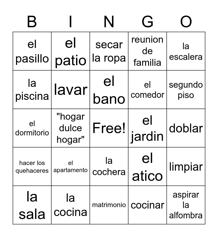 This bingo card has a free space and 24 words: el apartamento, la cocina, el bano, la sala, la escalera, el pasillo, la piscina, el patio, el jardin, la cochera, el comedor, el dormitorio, el atico, limpiar, lavar, cocinar, doblar, secar la ropa, segundo piso, "hogar dulce hogar", aspirar la alfombra, hacer los quehaceres, reunion de familia and matrimonio.