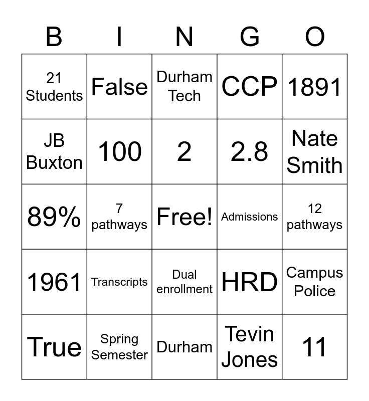 This bingo card has a free space and 24 words: True, Transcripts, 2, Tevin Jones, 1891, 21 Students, False, Durham Tech, Admissions, 12 pathways, 89%, 100, HRD, Campus Police, JB Buxton, Spring Semester, Durham, CCP, Nate Smith, 1961, 7 pathways, Dual enrollment, 2.8 and 11.