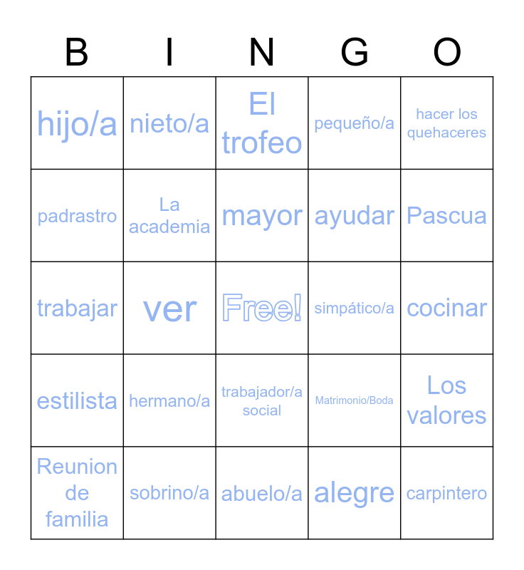 This bingo card has a free space and 24 words: hermano/a, sobrino/a, mayor, Reunion de familia, hacer los quehaceres, hijo/a, padrastro, nieto/a, simpático/a, trabajador/a social, ayudar, trabajar, Matrimonio/Boda, Los valores, La academia, alegre, cocinar, El trofeo, Pascua, ver, carpintero, estilista, pequeño/a and abuelo/a.