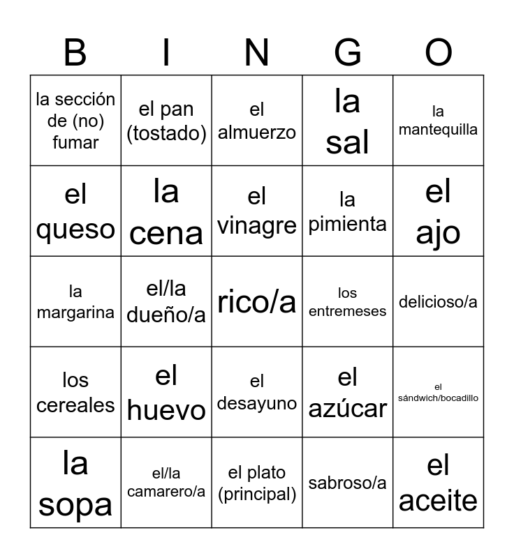 This bingo card has 30 words: el/la camarero/a, la comida, el/la dueño/a, el menú, la sección de (no) fumar, el almuerzo, la cena, el desayuno, los entremeses, el plato (principal), delicioso/a, rico/a, sabroso/a, el aceite, el ajo, el arroz, el azúcar, los cereales, el huevo, la mantequilla, la margarina, la mayonesa, el pan (tostado), la pimienta, el queso, la sal, el sándwich/bocadillo, la sopa, el vinagre and el yogur.