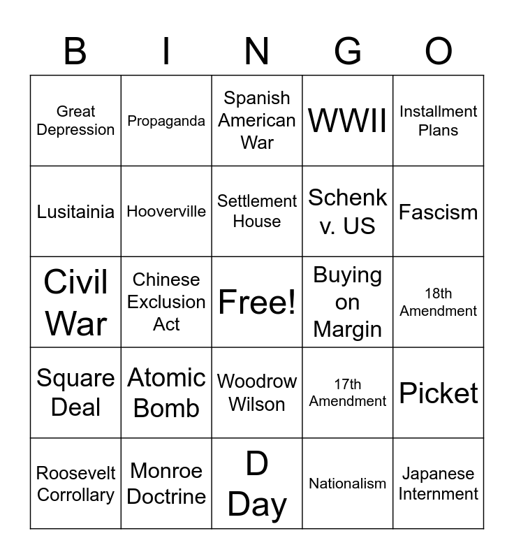 This bingo card has a free space and 54 words: New Deal, Square Deal, T. Roosevelt, Franklin D. Roosevelt, Woodrow Wilson, WWI, WWII, USS Maine, Lusitainia, Yellow Journalism, Great Depression, Upton Sinclair, Monroe Doctrine, Roosevelt Corrollary, Pearl Harbor, D Day, Japanese Internment, Schenk v. US, 19th Amendment, 18th Amendment, 17th Amendment, 16th Amendment, Buying on Margin, Installment Plans, Stock Market Crash, Propaganda, Militarism, Alliances, Imperialism, Nationalism, Social Security, Zimmerman Note, Booker T Washington, Cuba, Spanish American War, Trust, Civil War, Picket, Union, Hooverville, Gosepl of Wealth, Levittown, Route 66, Emergency Quota Act, Atomic Bomb, Flappers, Treaty of Versailles, Jamestown, Settlement House, Chinese Exclusion Act, Fascism, Segregation, Louisiana Purchase and Manifest Destiny.