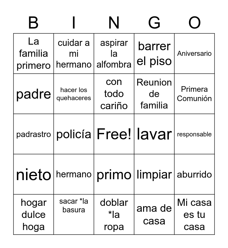 This bingo card has a free space and 24 words: hermano, sacar *la basura, con todo cariño, hogar dulce hoga, Aniversario, La familia primero, padre, cuidar a mi hermano, lavar, primo, Reunion de familia, padrastro, limpiar, aburrido, hacer los quehaceres, ama de casa, responsable, aspirar la alfombra, Primera Comunión, policía, Mi casa es tu casa, nieto, barrer el piso and doblar *la ropa.