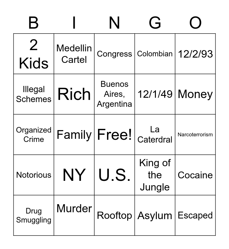 This bingo card has a free space and 24 words: NY, Murder, Buenos Aires, Argentina, Drug Smuggling, 12/2/93, 2 Kids, Illegal Schemes, Medellin Cartel, La Caterdral, U.S., 12/1/49, Organized Crime, King of the Jungle, Cocaine, Rich, Asylum, Narcoterrorism, Congress, Money, Family, Escaped, Notorious, Colombian and Rooftop.