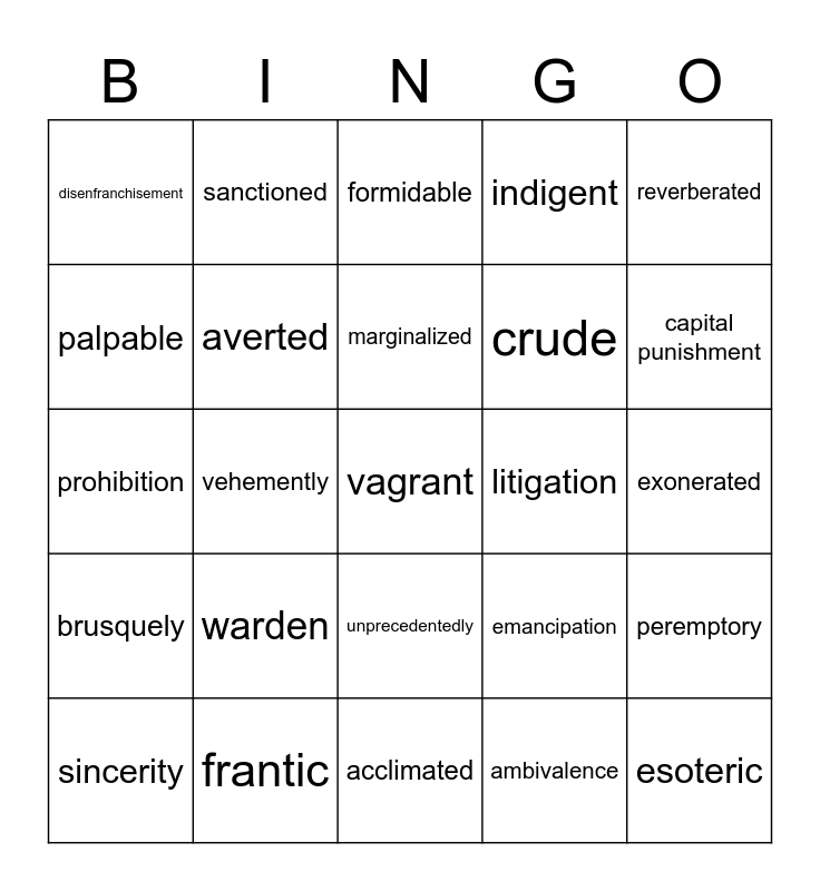 This bingo card has 34 words: esoteric, ambivalence, plight, ominously, brusquely, averted, reverberated, sincerity, sanctioned, abstract, marginalized, formidable, punitive, econometrics, litigation, capital punishment, frantic, prohibition, warden, emancipation, unprecedentedly, inevitably, disenfranchisement, exonerated, acclimated, vagrant, indigent, astutely, crude, palpable, vindicated, vehemently, peremptory and anomaly.