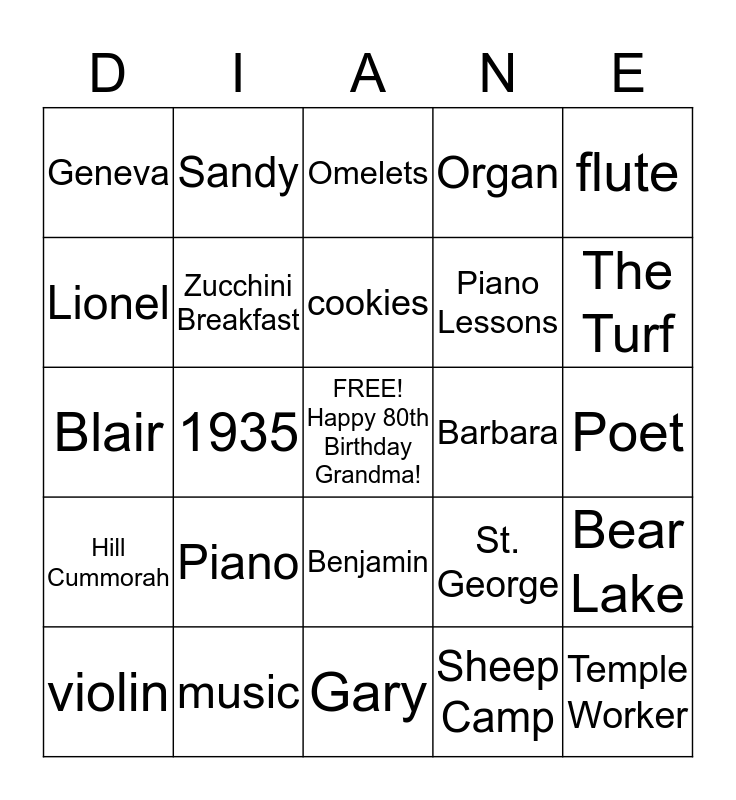 This bingo card has a free space and 24 words: Piano, music, cookies, violin, flute, Geneva, Lionel, Sandy, Barbara, Benjamin, Piano Lessons, Blair, St. George, Bear Lake, Zucchini Breakfast, Sheep Camp, Poet, Omelets, The Turf, 1935, Temple Worker, Hill Cummorah, Organ and Gary.