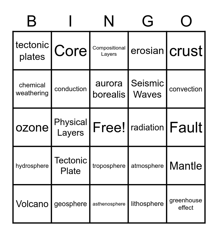 This bingo card has a free space and 24 words: Tectonic Plate, geosphere, aurora borealis, Volcano, crust, tectonic plates, chemical weathering, Core, radiation, troposphere, Seismic Waves, ozone, atmosphere, Mantle, conduction, lithosphere, Fault, Compositional Layers, convection, Physical Layers, greenhouse effect, hydrosphere, erosian and asthenosphere.