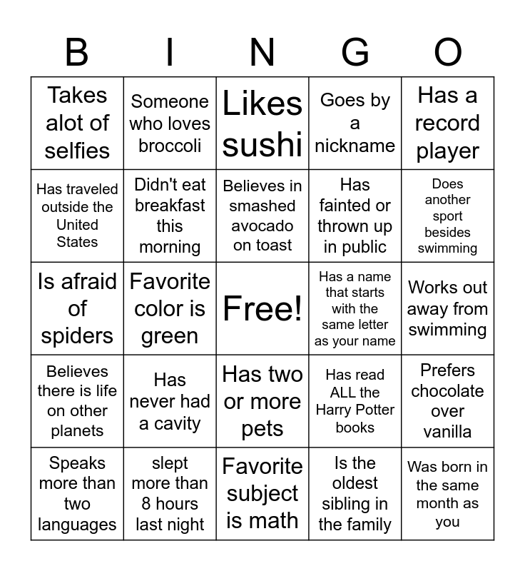 This bingo card has a free space and 24 words: Has never had a cavity, slept more than 8 hours last night, Believes in smashed avocado on toast, Speaks more than two languages, Has a record player, Takes alot of selfies, Has traveled outside the United States, Someone who loves broccoli, Has a name that starts with the same letter as your name, Has two or more pets, Has fainted or thrown up in public, Is afraid of spiders, Has read ALL the Harry Potter books, Prefers chocolate over vanilla, Didn't eat breakfast this morning, Is the oldest sibling in the family, Works out away from swimming, Likes sushi, Does another sport besides swimming, Favorite color is green, Was born in the same month as you, Believes there is life on other planets, Goes by a nickname and Favorite subject is math.