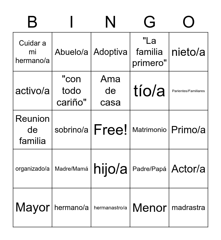 This bingo card has a free space and 24 words: Madre/Mamá, hermano/a, Ama de casa, Mayor, nieto/a, Cuidar a mi hermano/a, activo/a, Abuelo/a, Matrimonio, hijo/a, tío/a, Reunion de familia, Padre/Papá, Actor/a, "con todo cariño", Menor, Primo/a, Adoptiva, Parientes/Familiares, sobrino/a, madrastra, organizado/a, "La familia primero" and hermanastro/a.