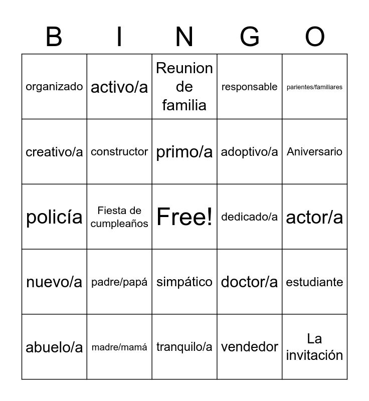 This bingo card has a free space and 24 words: padre/papá, madre/mamá, primo/a, abuelo/a, parientes/familiares, organizado, creativo/a, activo/a, dedicado/a, simpático, adoptivo/a, policía, doctor/a, estudiante, constructor, vendedor, actor/a, Reunion de familia, Aniversario, Fiesta de cumpleaños, La invitación, nuevo/a, responsable and tranquilo/a.