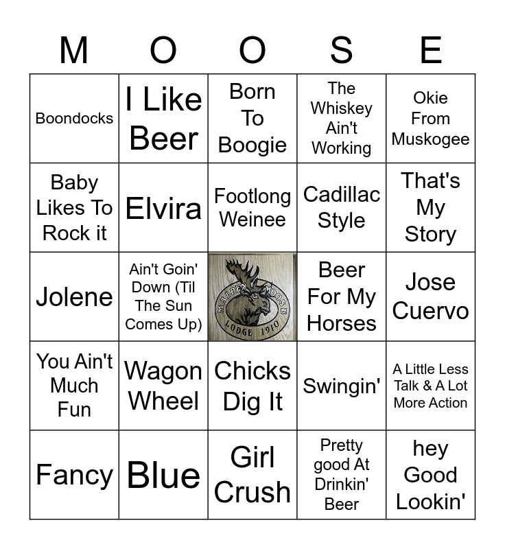 This bingo card has a free space and 77 words: Bubba Shot The Juke Box, Devil Went Down To Georgia, Born To Boogie, A Country Boy Can Survive, Lifestyles Of The Not So Rich & Famous, Somethin' In The Water, Pray For You, Dixieland Delight, Good Little Girls, Legend Of Wooley Swamp, I Don't Even Know Your name, Attitude Adjustment, Footlong Weinee, Baby Likes To Rock it, Drink Drank Drunk, Ain't Goin' Down (Til The Sun Comes Up), Kaw-Liga, hey Good Lookin', Ring Of Fire, Okie From Muskogee, You never Even Called Me By my name, Jolene, Elvira, I Like Beer, The Whiskey Ain't Working, Family Tradition, Honky Tonk Man, Louisiana Saturday Night, Rock My World, Long Haired Country Boy, Watermelon Crawl, If I Could Make A Living, The Fireman, Swingin', That's My Story, Cadillac Style, Money In The Bank, If I Said You Have A Beautiful Body, Jose Cuervo, Pretty good At Drinkin' Beer, 5-1-5-0, Red Solo Cup, The More I Drink, Friends In Low Places, Ol' Red, Some beach, Fancy, Boondocks, All Jacked Up, Dust On The Bottle, Hold My beer, Chicks Dig It, Before he Cheats, Snapback, Guys Like Me, Better Class Of Losers, Drink Swear Steal & Lie, Hillbilly bone, Lightning Does The Work, Save Water Drink Beer, Wagon Wheel, Are You Gonna Kiss Me Or Not, H.O.L.Y, John Deere Green, Meet In The Middle, Past The Point Of Rescue, Goin' Through the Big D, Beer For My Horses, Drinkin' Bone, I Feel lucky, Be My Baby Tonight, A Little Less Talk & A Lot More Action, You Ain't Much Fun, Blue, Did I Shave My Legs For This?, Girl Crush and Pontoon.